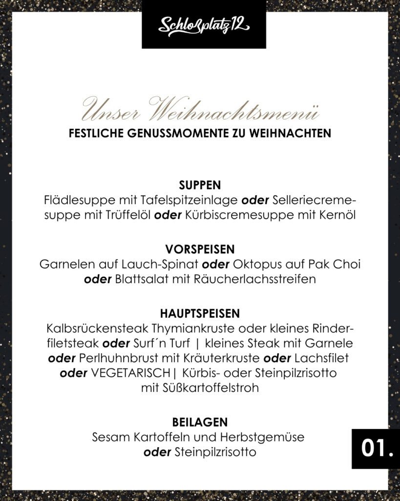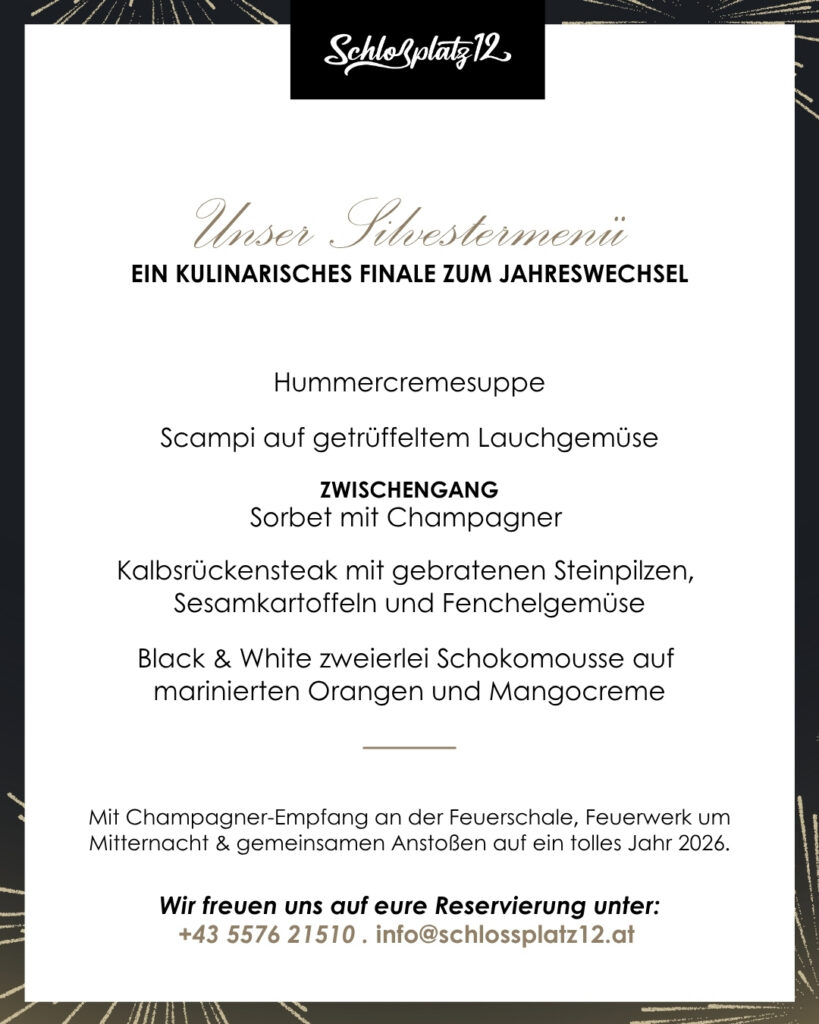 Also nicht länger warten, am besten Freunde einladen und ab 4 Personen eine gemütliche Loungebox oder ab 7 Personen den großzügigen Gala-Tisch reservieren. Intimes Dinner zu Zweit? Gerne empfangen wir Sie am Panoramatisch mit Blick auf den Schlossplatz, am kuscheligen Romantik-Tisch bei der Champagnerbar oder an der Bar.
