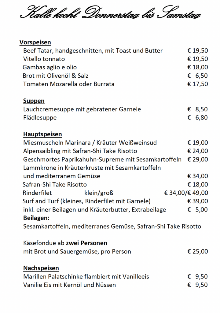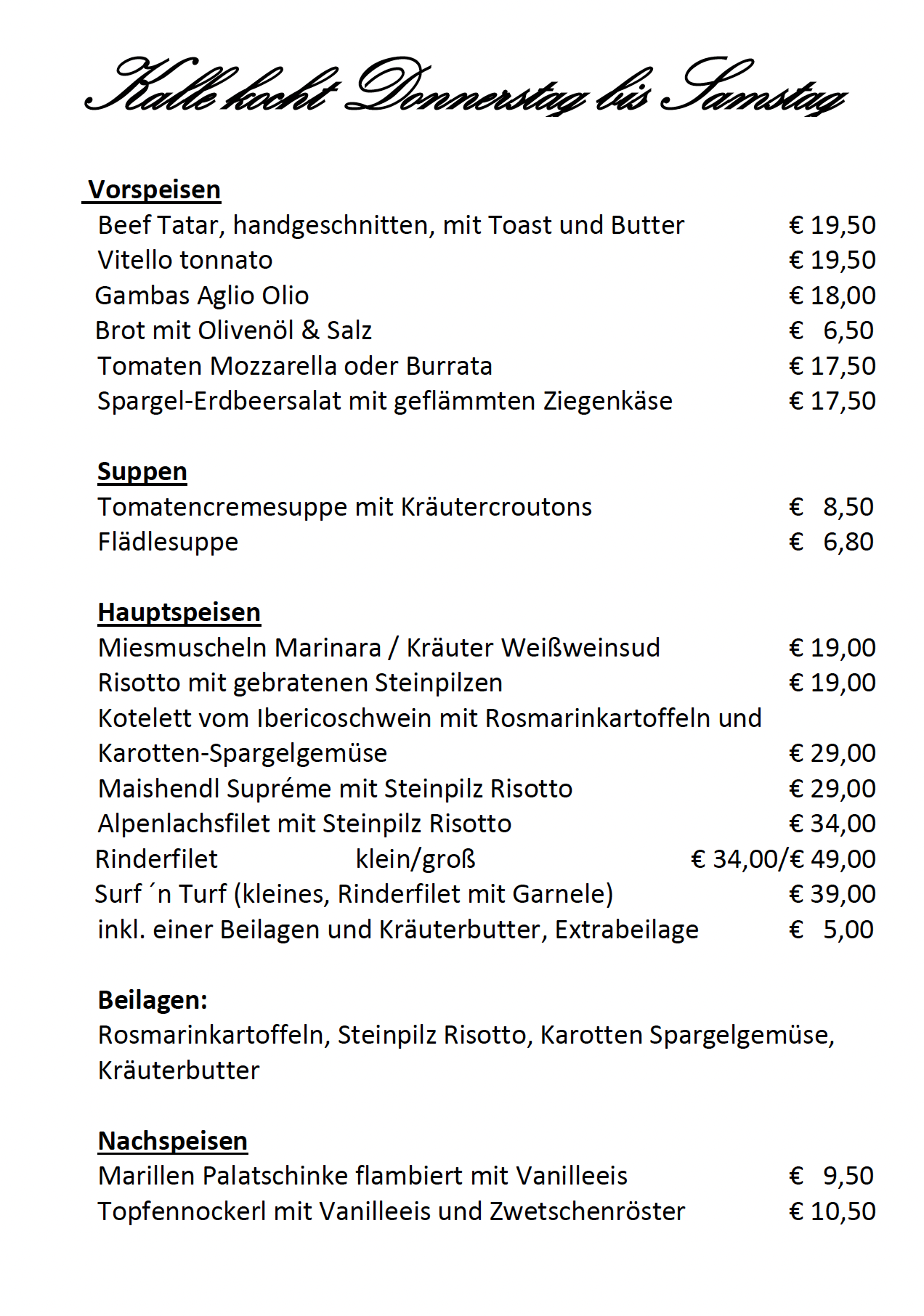 Kalle kocht für euch – mit einer kleinen, feinen Auswahl an saisonalen und regionalen Gerichten. Jede Woche erwartet euch eine frische Mischung aus Klassikern und besonderen Spezialitäten: von mediterranen Highlights wie Gambas oder Vitello Tonnato bis hin zu beliebten österreichischen Gerichten wie Flädlesuppe, Zwiebelrostbraten oder saftigem Gulasch.